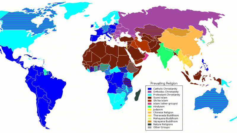 Африкийн хойд хагас бүхэлдээ исламын шашинт орнууд болохыг та харж байгаа байх. Харин Сахарын цөлөөс урагш орших улс орны иргэд Европын чухам аль орны колони байснаасаа шалтгаалж католик юм уу, протестант номтон болон өөр хоорондоо холилдон сууцгааж байна. Африкийн зүүн хэсэгтэй залгаа Ойрх Дорнод Израилийг эс тооцвол бүгд исламын шашинт бол Төв Азийн орнууд мөн исламын өнгөөр "ногоорно".