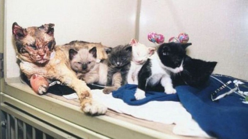 Хуучны нэгэн гараашт дөрвөн муужгайтайгаа толгой хоргодож байсан уг муур галын аюулаас муужгайнуудаа аварч байхыг хотын гал сөнөөгчид харсан байна. Тэдний ярьснаар эх муур бие нь шатаж байхад ч муужгайнуудаа нэг нэгээр нь зуун, гараашнаас гаргах гэж тэмцэж байж. Түүгээр ч барахгүй, гараашны хажууханд байсан нэг золбин гөлгийг мөн аварчээ. Гал сөнөөгчдийн тусламжтайгаар дөрвөн муужгайн хамт эсэн мэнд үлдсэн эрэлхэг муурны түүх олон хүний сэтгэлийг хөдөлгөж, муужгайнуудынх нь хамт өргөж авах 1000 гаруй санал ирсэн гэдэг.