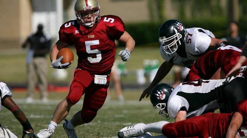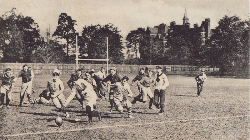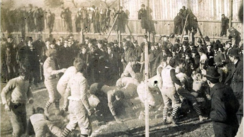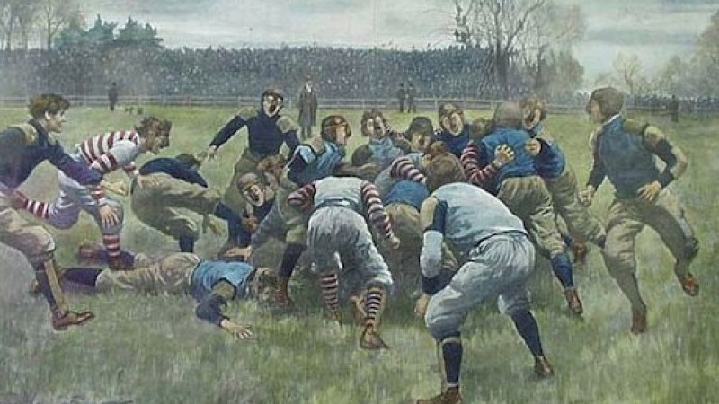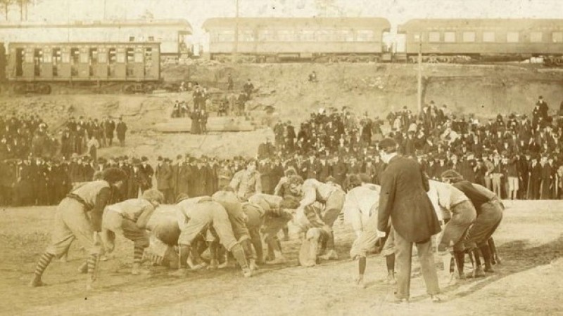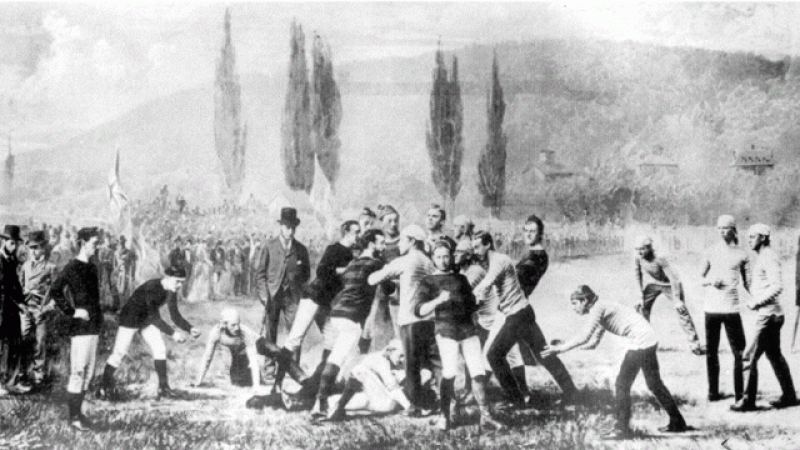 Анхны америк хөлбөмбөгийн тоглолт 1869 оны 11-р сарын 6-ны өдөр Принстон болон Рутжерсын хооронд зохиогджээ. Гэвч энэ тоглоом нь хөлбөмбөгтэй илүү төстэй байв. Энэ тоглолтын дараа Йелийн их сургууль өөрсдийн "Бостоны тоглоом" гэх спортоо хөгжүүлж эхэлсэн. Энэ нь хөлбөмбөгтэй төстэй байсан ба хэрэв өрсөлдөгчдөө хөөгдөж эхэлбэл бөмбөгөө барин гүйж болох ба мөн дамжуулж болдог байв. Харин өрсөлдөгчдөө хөөгдөөгүй үедээ бөмбөгөө өшиглөдөг байсан байна.
