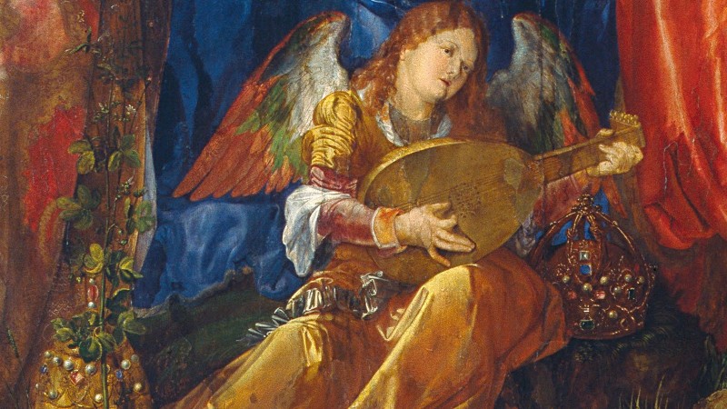 Шүтээний өмнөх суудалдаа заларсан Гэгээн Мариа хүүгээ тэврэн сууж, түүний дээхнэ сахиусан тэнгэрүүд ниснэ. Мөн түүний өмнө Пап лам хоёрдугаар Жулио эзэн хаан нэгдүгээр Максимиллиан нар өвдөг сөгдөн суусан байна. Зурагт буй хамгийн сонирхолтой нэг зүйл бол зураач өөрийгөө зурсан нь юм. Севилийн Велазкюз шиг өөрийгөө зургийн гол дүрүүдтэй зэрэгцүүлж, эсвэл шадар цэргийн хувцастай зурсангүй. Харин баруун эгнээний хамгийн цаад өнцөгт даруу байдлаар дүрсэлжээ.