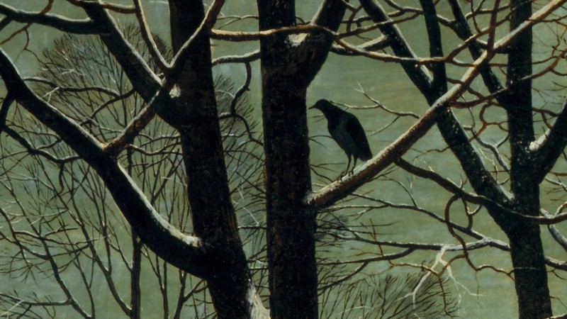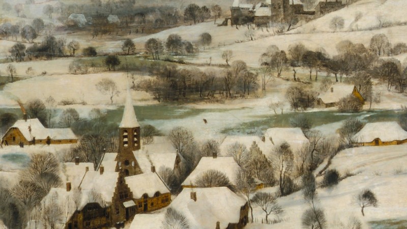 Түүний улирал, байгалийг дүрслэх энгийн хэрнээ бусдаас онцгой байдлыг энэ зургаас харж болно. Өндөр уулсын дундах цасанд дарагдсан жижиг суурин үлгэрийн мэт харагдах ч эрхгүй хүйтэн өвлийг санагдуулна. Наад талаас захлан алслах бараан өнгөтэй нүцгэрсэн модод цастай уулаас ч илүү хүйтэн уур амьсгал бүрдүүлж, моддын дундуур нохдоо дагуулж, зэвсгээ агссан анчид хотыг чиглэн алхах нь урт аянаас харьж ирж буй бололтой. Гэвчиг бүх юм зогссон мэт энэ байдлыг мөсөн дээр байх хүмүүс, тэнгэрт нисэж буй ганц шувуу амь оруулах шиг.