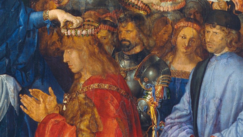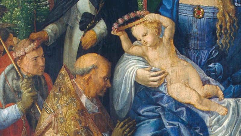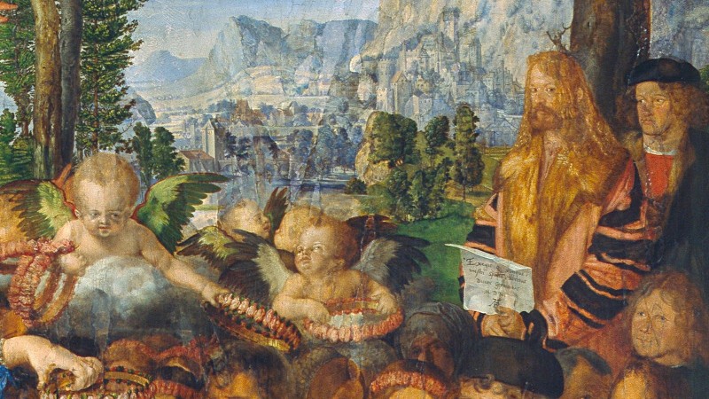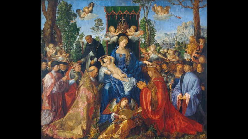 Нуремберг хотод төрж өссөн зураач Dürer-ийн энэ зураг одоо Прага хотын үндэсний галлерейд хадгалагддаг. Анхлан Италид хөл тавьсан хойд европ уран бүтээлчдийн нэг байсан Dürer-ийн зургуудад шашны үзэл санаа бүхий олон бүтээл бий. 1505 онд Италид хоёр дох удаагаа ирэхдээ тэрээр Венеци хотноо суурьшжээ. Тухайн үед цагаачид, худалдаачид тэргүүтэй олон Германчууд Венецид амьдарч байв. Тэдний хүсэлтээр бүтсэн энэ зураг хожим 1606 оныг хүртэл Гэгээн Бартолеомогийн сүмийн шүтээний танхимд заларч байжээ. Готик хэв маягаас Сэргэн мандалтын хэв маяг руу хэмээх шилжилтийн үеийн энэ зургаа өөрийнх нь хамгийн сайн бүтээл гэдэгтэй зураач өөрөө ч бас санал нийлдэг байж.