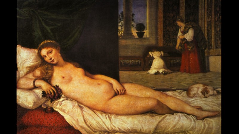 Мөн л Флоренц дах Уффицигийн галлерейд буй энэ зураг Венеци хотын алдарт зураач Тицианы бүтээл юм. Урбиногийн ван гэрлээд удаагүй эхнэртээ зориулж анх захиалсан гэгддэг энэ зурагт эрээ цээргүй мэт харц, эротик байдал багагүй шингэснийг харахад анхнаасаа олон нийтэд үзүүлэхээр зураагүй байх гэлтэй. Энэ зургийг дагасан цөөнгүй маргаан байдгийн нэг нь Венераг хэтэрхий задгай гэмээр дүрсэлсэнтэй холбоотой юм. Үнэхээр л нүцгэн биеийг нь хаах гивлүүр ч үгүй, цоо ширтэх харцтай энэ гоо үзэсгэлэнт эмэгтэй дурлалын бурхан Венера эсэхэд эргэлзмээр.