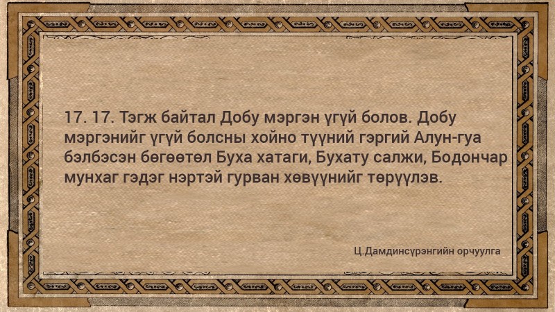 ..."Энэ бүхний улмаас бид уг эхийн дотор хятад үсгийн галиг ба хятад хадмал болон товч (ерөнхий) орчуулгаас өөрөөр сэргээсэн өөрөөр ойлгож тайлбарласан 700 орчим үг хэллэгийн доор дараалалт тоон зүүлт хийж хойно нь хавсаргасныг нягтлан болгоож ийнхүү өөрчлөн сэргээсний зөв бурууг тунгаан шүүнэ үү".... гэжээ.