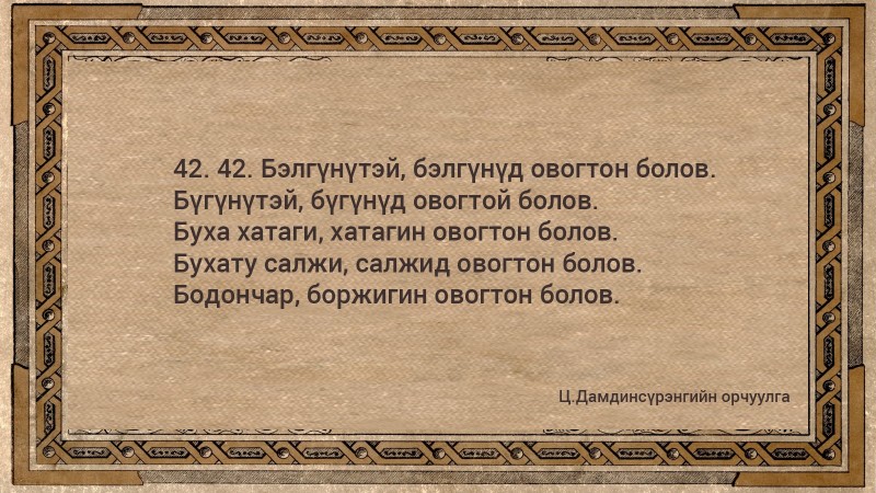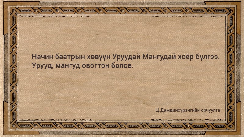Гуравт. Худам монгол бичигт үйл үгийг эр эм хүйс ялган бичдэг ёс арилаагүй байсан гэдэг журмыг үндэс болгов.