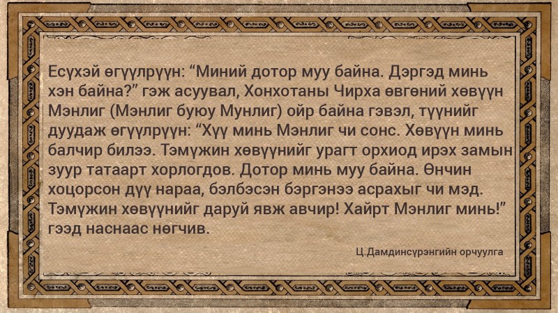 Агт үхвэл шир нь гэрээс" гэсэн заншил ёсоор Тэмүжин болон дүү нарт нь хойд эцэг, Өгэлүн үжинд эрийн гэрээсээр асарч явах хоёрдох эр нь болсон тул түүнийг улсын албан ёсны түүхэнд "Мэнггэлик эцэг" гэж тэмдэглэгдэх жам ёсны эрхтэй юм. Иймээс Чингис хааны түүх "МНТ"-д "Мэнггэлик эцэг" гэж тэмдэглэгдсэн ажээ.