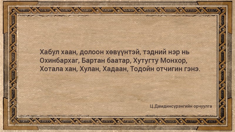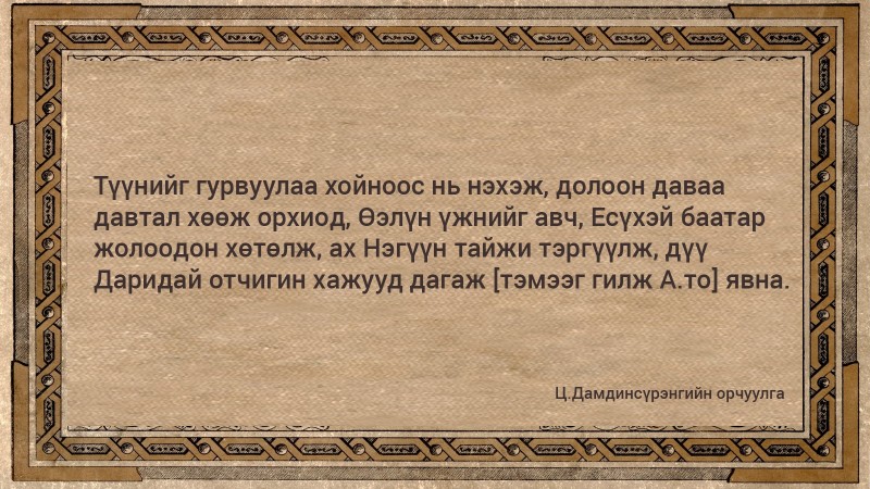 Дөрөвт. Худам монгол бичигт нэр үг (заримдаа үйл үг ч) хүртээл нэртэйгээ ганц ба олон тоогоор зохицдог ёс арилаагүй байсан зэрэг хэд хэдэн ялгааг гарган бичиж байсан гэдэг зарчмыг баримтлан энэ эхийг сэргээхийг чармайсан болно"...
