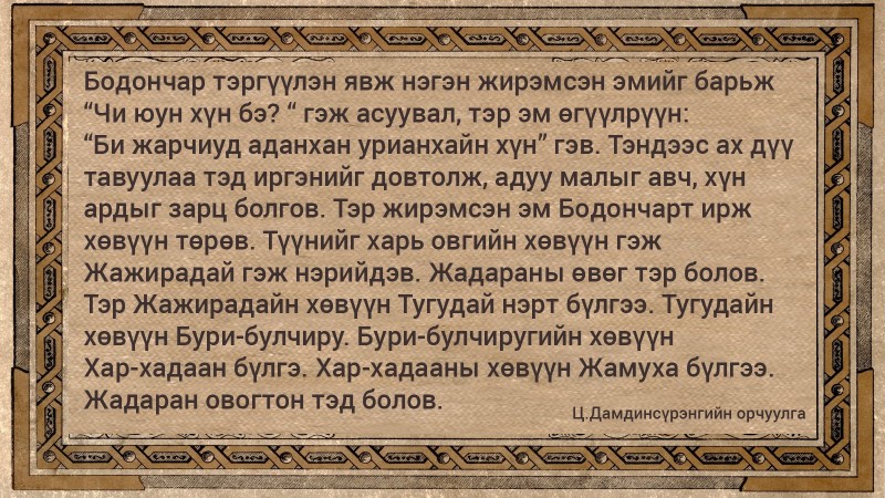 "МНТ"-ы 155 дугаар зүйлд Есүй хатан Чингис хаанд хэлэхдээ: "нама-ий күмүн-э бода-д-а болгажу" гэсэн "хүний ихэд тоож" гэсэн утгатай хэлсэн байдаг, мөн Бода (том) мал, бог (жижиг) мал гэж хэлэлцэнэ. "Мунхаг" гэсэн нь угтаа Боданчар Ман хан буюу "бидний хан" утгатай цол байсан атал үүнийг Нууц товчооны зохиогч уран сайхны зорилгоор "мунхаг" гэсэн үг болгон Боржигид овгийн толгойлогчийн бэрхшээл давж гарч ирснийг харуулах гэж зориуд үгийн гаралыг таамаглан тогтоох ардын гарал зүйн тайлбар хийсэн байна.