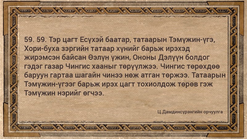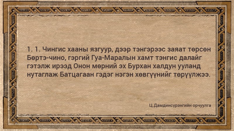 ...."Энэ ойд зориулан уншигч олондоо толилуулах гэж байгаа энэ ном бол Монголын нууц товчооны худам монгол бичгийн эхийг сэргээн босгохыг оролдсон анхны туршиц болно. Энэ ажлыг зориглон оролдсон учир бол Монголын нууц товчооны урьд эрдэмтдийн сэргээсэн олон эх болбол МНТ-ы хятад үсгийн галигийг уг дурсгалт бичгийг зохиогдсоноос хойш зуугаас зуун тавиад жилийн дараа түүний анх бичигдсэн худам монгол бичгийн эхээс нь шууд буулгасан биш, харин түүнийг XIV зууны II хагасын монгол хэлний дуудлагаар буулгаж тэмдэглэсэн байна гэсэн дүгнэлтэнд хүрсэн юм. Чухам энэ учраас "... нууц товчооны" хятад үсгийн галигийг яаж ч нарийвчлан судлаад түүний анхны худам монгол бичгийн эхийг бүрэн зөв сэргээх боломжгүй шиг санагдана. Энэ зохиолын анх бичигдсэн худам монгол бичгийн эхийг энэ хир сэргээн босгож чадаагүй учраас эл дурсгалт бичгийг утга зохиолын үүднээс нарийвчлан судлах боломж бүрдээгүй байна гэж бид үзэж байна"...