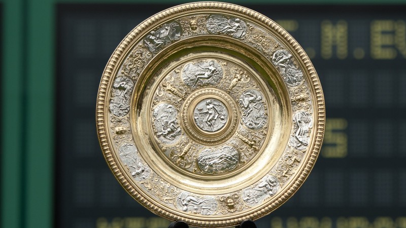 Анх 1887 онд танилцуулсан энэхүү цом хэзээ ч Бүх Английн клубээс өөр газар байх ёсгүй. Асар үнэ цэнэтэй жижигхэн алтан цомыг жилд ердөө нэг л удаа цомын өрөөнөөс гаргаж, эрэгтэйчүүдийн төрөлд ялсан тамирчинд гардуулдаг. Аварга тамирчин цомыг ердөө 1 цаг л барих эрхтэй бөгөөд хугацаа дуусмагч эргүүлэн хоргоны цаана тавьдаг байна. Цомын дээр нь ханборгоцой хийсэн байдаг. Уг нь уг тэмцээний бэлэг тэмдэг болсон жимс нь гүзээлзгэнэ боловч 17-р зуунд ханборгоцой хамгийн үнэтэй, хамгийн ховор жимснүүдийн тоонд орж, баячуудын эд хөрөнгийг бэлэгддэг болсон байна. Иймээс уг цомыг ханборгоцойгоор чимэглэжээ. Түүнчлэн цом дээр сийлсэн үг нь тун сонирхолтой. “Бүх Английн өвсний теннисийн клубын нэг гарт дэлхийн аварга”. Тийм ээ, “нэг-гарт”. Энэ нь одоогийн тамирчдын үзүүлдэг шиг хоёр гарын тоглолт бус Английн уламжлалт нэг гарт барилтыг илтгэсэн үг юм байна.