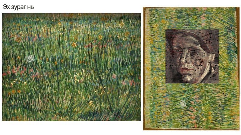 Тун өрөвдөлтэй амьдралын түүх бүхий алдарт зураач Винсент ван Гогийн бүтээлүүд өдгөө асар үнэ цэнэтэй билээ. Түүний 1887 онд зурсан “Өвс” зургийн доор нэгэн эмэгтэйн хөрөг зураг нуугдаж байсныг Голланд, Белгийн эрдэмтэд илрүүлсэн байна. Хөх болон ногоон өнгийн уг зургийн доор байсан хөрөг зургийг улаан болон бор өнгөөр зурсан байжээ. Уг нээлтийг рентген туяагаар өнгө ялгах техник ашиглан хийсэн аж. Зурагт дүрсэлсэн эмэгтэй нь жирийн ард эмэгтэй байх бөгөөд хэн гэдэг нь тодорхойгүй байгаа юм. Ван Гог үргэлж мөнгөөр гачигдаж амьдарч байсан ба зотонгоо дахин ашиглах тохиолдол олон байжээ.