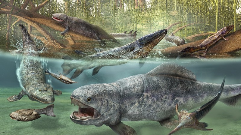 Ургамал газарт тархсан нь усны амьтдыг хуурай газар луу дуудав. Газар луу “нүүсэн” анхны амьтан бол 400 сая жилийн өмнө уснаас гарсан хорхой шавж юм. Удалгүй загас газрын амьтанд хувилж, дөрвөн мөчтэй боллоо. Тиктаалак хэмээх усны гүрвэл ийн хувьссан анхны амьтан агаад бүх хоёр нутагтан, хэвлээр явагч, сүүн тэжээлтнүүдийн дээд өвөг болсон юм.
