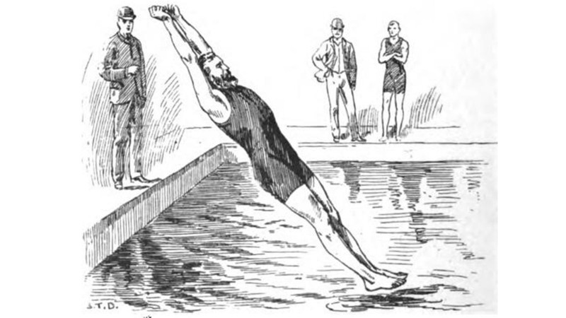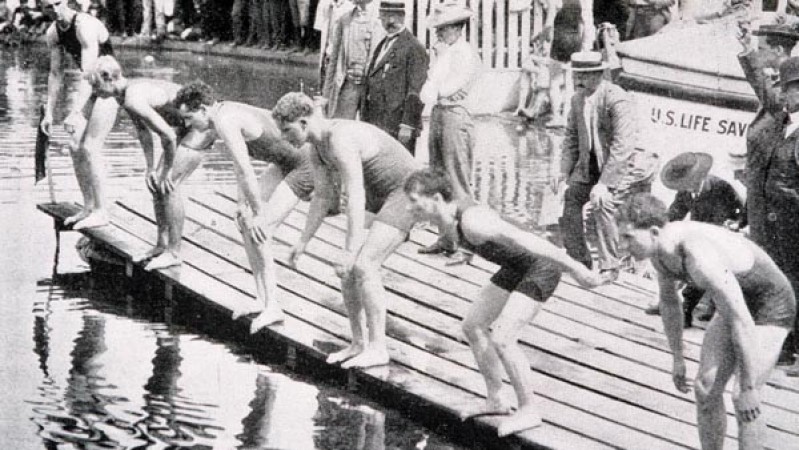 Нэг удаа л Олимпийн наадамд орсон спортын төрлүүдийн буухианы үргэлжлэл болж саадтай сэлэлтийн төрөл 1900 оны Парисын Зуны Олимпийн наадамд Сена мөрөнд болжээ. Тамирчид 200 метрийн замыг туулахдаа гурван төрлийн саадыг туулдаг байна. Эхлээд шон дээгүүр авирч, эгнүүлэн тавьсан завинууд дээгүүр гүйж, дараа нь завинууд доогуур сэлдэг байлаа. Өмнөх спортуудаас ялгаатай нь уг тэмцээнд таван улсын 12 тамирчин өрсөлдсөн байна.