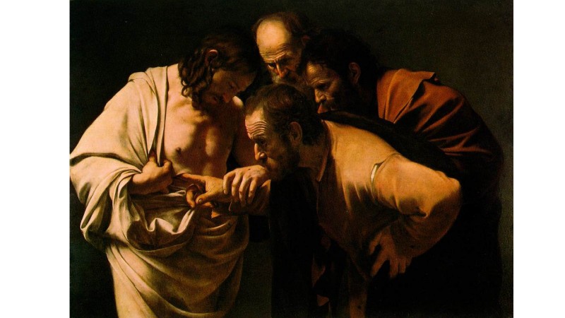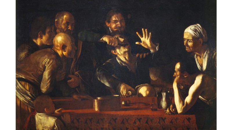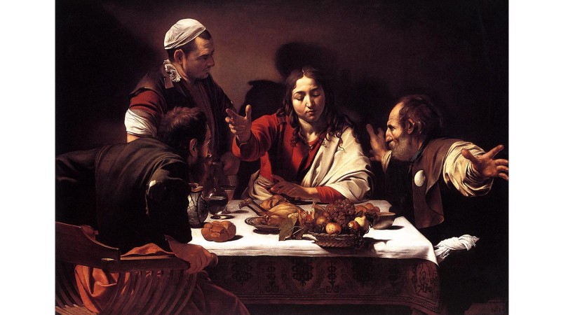 Лондоны Үндэсний галерейд хадгалагдан буй “Эммаусынд барьсан оройн зоог” нэрт зургаас нь тэрхүү гэрэл, сүүдрийн ялгарал илэрхий тод харагдана. Есүс Христийг загалмайд цовдлоод удаагүй байхад, нэгэн үдэш түүний хоёр дагалдагч зоогийн ширээний ард тохой нийлүүлэн суугаа хүн нь үнэн хэрэгтээ дахин амилсан Есүс болохыг ухаарч буй агшныг уг зурагт дүрсэлжээ. Чингэхдээ гайхамшигт явдал тохиосныг сэхээрэн байгааг нь гэрэл, сүүдрийг өгүүлэн буй явдлын нэгэн хүүрнэгч болгосноор тодотгож өгсөн байна. Караважо зугтаж зайлах аргагүй бодит байдал хийгээд ер бусын театрчилсан уур амьсгал хоёрыг ийн сүлснээрээ Библийн түүхүүдийг урьд байгаагүйгээр, хэн бүхэнд ойлгогдохоор амилуулжээ. Эртний түүх домгийг өөрийн цаг үедээ авчирч, жирийн үзэгчийг хүртэл болж буй явдалд татан оролцуулах нь түүний ер бусын авьяас билиг байлаа. “Эммаусынд барьсан оройн зоог” шиг өрнүүн өгүүлэмжтэй зургуудыг ойлгож мэдрэхийн тулд шашин шүтлэг, судар номтой холбогдох учир явдлуудыг заавал мэдэх шаардлагагүй юм.