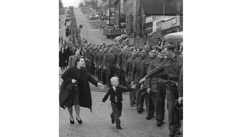 Клод П. Деттлофф 1940 оны аравдугаар сарын 1-нд Канадын Нью-Уэстминстер хотод энэхүү алдарт зургаа авчээ. Бритиш Коламбиа мужийн цэргийн анги, нэгтгэл хотын гудамжаар жагсаж явах үед бяцхан хүү ээжийнхээ гараас зугтаж, дайнд мордсон аавдаа сүүлийн удаа баяртай гэж хэлэхээр гүйж буй тэр агшин түүхэнд мөнхөрсөн юм. Хожим хүүг Уоррен Бернард гэгч болохыг олж таньсан байдаг.