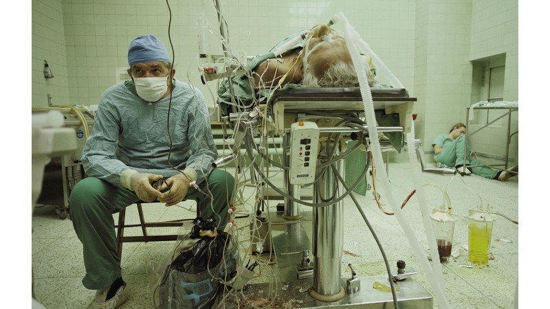 National Geographic сэтгүүлд хэвлэгдсэн энэ гэрэл зургийг Жеймс Стэнфилд 1987 онд авчээ. Польшийн зүрхний мэс заслын эмч Збигнев Релига зүрх шилжүүлэн суулгах амь дүйсэн мэс заслыг амжилттай гүйцэтгэж дуусаад амсхийж суугаа нь энэ юм. Туйлдаа хүртэл ядарсан түүний туслах эмч өрөөний буланд харагдана.