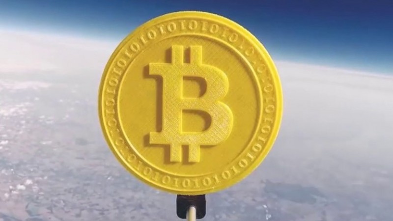 “Genesis Mining” компани 2016 онд биткоины 3 хэмжээст модел хийн, цаасан хэтэвчийг наалддаг туузаар наан сансар руу нисгэсэн байна. Тэд энэ моделио цаг уурын бөмбөлөгт дүүжилж хөөргөсөн бөгөөд аялалын бүхий л үед GoPro камер ашиглан бичлэг хийсэн байдаг. Бөмбөлөг газраас 20 км-ийн өндөрт хөөрсөний дараа газраас 1 биткоиныг тэнгэрт буй хэтэвч рүү гар утаснаас амжилттай шилжүүлж, үүний дараа боломжит хамгийн дээд цэг болох 34 км-ийн өндөрт хүрэхэд нь дахин нэг шилжүүлэг хийсэн аж.