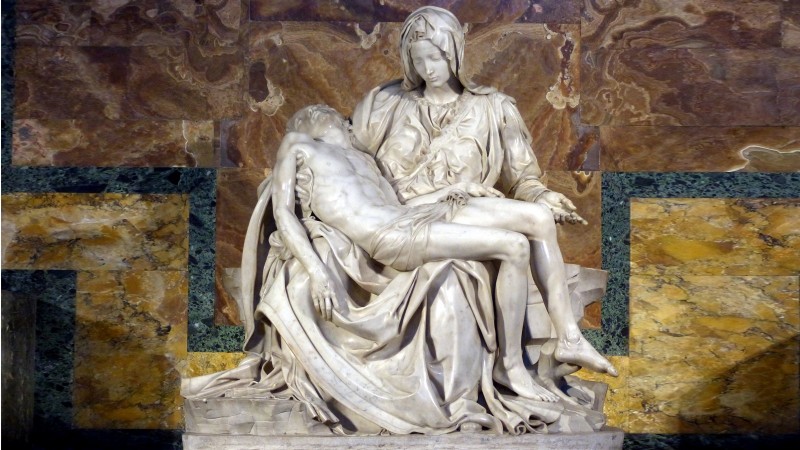 Микеланжело (1475-1564)-гийн энэхүү бүтээлд ганц хүүгээ алдчихаад, цогцсыг нь өвөр дээрээ тэврэн, энэлэн шаналж буй Ариун Мэрийг дүрсэлжээ. Есүс Христийн үхлийг харуулсан эл бүтээлээ туурвихдаа Микеланжело ердөө 20 гаруйхан настай, олонд танигдаагүй зураач байлаа. Харин 1498-99 онд бүтээсэн уг гантиган баримал нь түүнийг нэр алдартай болгосон байна. Нэгэн сонирхолтой баримт дурдахад “Пьета” нь Микеланжелогийн гарын үсгээ үлдээсэн ганц бүтээл нь юм.