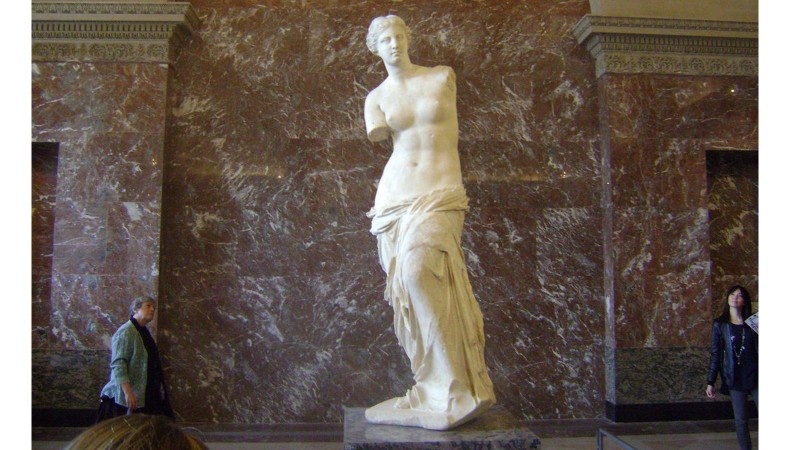 Грекийн Афродита бурхан буюу ромчуудын Венера хэмээн нэрийдэж ирсэн охин тэнгэрийн эл баримал МЭӨ 130-100-гаад оны үед хамаарна. Хүний бодит хэмжээнээс ялигүй том, 203 см өндөр уг гантиган хөшөө 1820 онд Грекийн Милос арлаас олдохдоо л хоёр гар болон суурины хүрээгүй байжээ. Луврийн музейн хамгийн үнэ цэнтэй үзмэрийн нэг, ер бусын нарийн уртай уг баримал анхандаа ямар дүртэй байсан, хоёр гар нь ямархуу байрлалтай байсан талаар мэргэжилтнүүд өнөө ч маргалддаг. Харин байж болох хамгийн боломжит хувилбар нь хажууд нь жижигхэн багана байсан, түүн дээр зүүн гараа тавьсан байсан гэх таамаг юм.