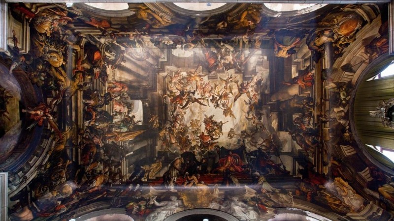 Энэ барок загварын мөргөлийн сүмийн барилга нь хараахан дуусаагүй юм. 17-р зууны сүүл үед 443 м.кв таазыг тосон будгаар будаж, далавчит сахиусан тэнгэр, алтлаг өнгийн тэнгэр, диваажингийн цагаан гэрэл зэргийг дүрсэлсэн зураг зуржээ. Уг сэтгэл хөдөлгөм бүтээлийг Жиан Антониа Фумиани туурвисан байна. 19-р зууны Английн нөлөө бүхий шүүмжлэгч Жон Раскин уг зургийг энгийн , бүдүүн бараг хэмээн шүүмжилч байсан ч түүний буруу байсан юм.