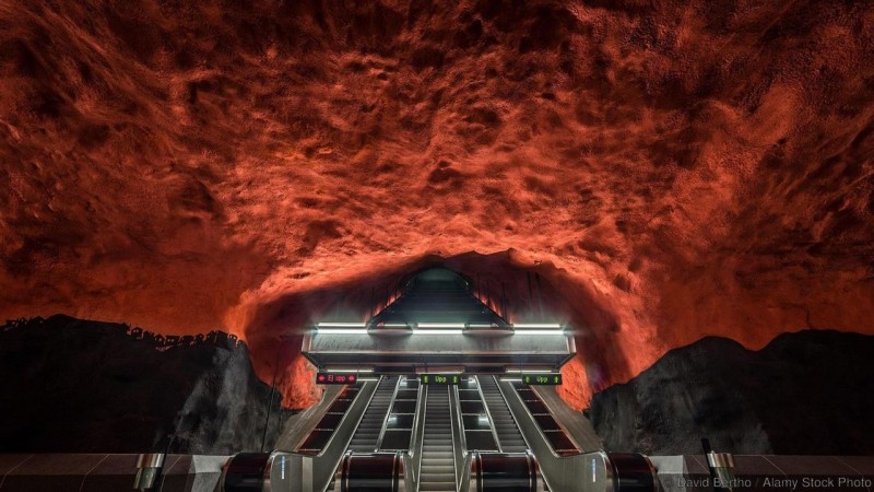 Стокгольмын Солна Сентриум худалдааны төвийн Blue Line метроны буудал нь 1975 оноос хойш ашиглагдаж байгаа аж. Зураач Anders Åberg, Karl-Olov Björk нар газар доорх суурь чулуулаг шөнийн цагт улаан өнгөөр гэрэлтдэг болохыг олж илрүүлжээ. Метроны буудал шидтэний агуйг санагдуулам харагддаг бөгөөд 1957 оноос өөр олон уран бүтээлчид метрон дээр зураг зурж, шудрага ёсны тухай үг, тайлбар бичих болсоноор уг метроны буудал хамгийн урт уран зургийн галларей болжээ.