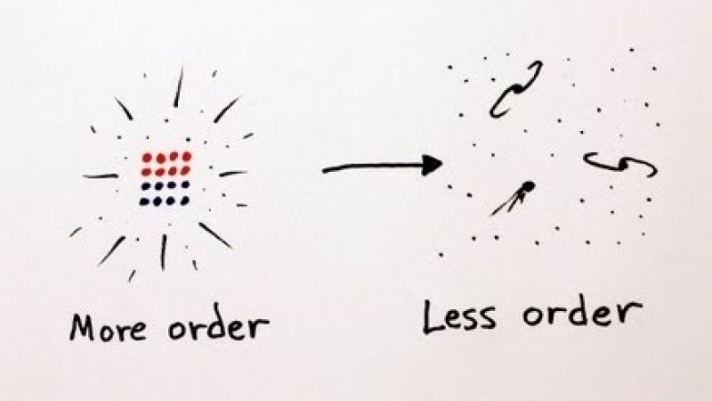 Бидний сайн мэдэж байгаа нэг зүйл бол цаг хугацаа үргэлж энтроп өсөх чиглэлд урсдаг. Энтроп гэдэг нь системийн эмх замбараагүйг тодорхойлдог ойлголт юм. Энтроп зөвхөн ихэсдэг, өөрөөр хэлбэл ертөнц дээрх бүх зүйлс эмх замбараагүй ихсэх хандлагатай байна. Гэвч орчлон ертөнц анх үүсэх үед энтроп маш бага байсан гэж үздэг. Их тэсрэлтийн үед энтроп асар бага байсан ба маш их хэмжээний энерги жижигхэн цэг дээр төвлөрсөн төлөвт байжээ. Өөрөөр хэлбэл ертөнц нь өөрийн эхлэлийн үедээ эмх замбараагүй биш, харин ч маш цэгцтэй замбараатай төлөвт байсан болж таарах нь. Харин яагаад, яаж гэдгийг мөн л хэн ч мэдэхгүй.