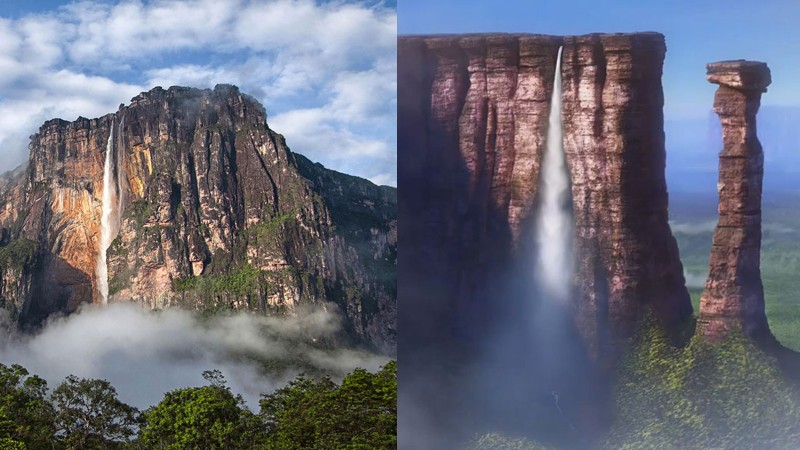 "Дээшээ" хүүхэлдэйн кинонд гардаг "Диваажингийн хүрхрээ" нь Венесуэль улсын нутагт орших Анхелийн хүрхрээ бөгөөд энэ нь дэлхийн хамгийн өндрөөс (979 метр) унадаг хүрхрээ юм. Алмазны эрэлд явж байсан АНУ-ын нисгэгч Жимми Эйнжэл Ауян-Тепуй уулын бэлээр нисэж яваад хожим өөрийнх нь нэрээр нэрлэгдэх болсон энэ газрыг нээсэн түүхтэй. Ауян-Тепуй гэдэг нь уугуул иргэдийн хэлээр "Чөтгөрийн уул" гэсэн утгатай. Учир нь энэ уулан дээр өдөр бүр шахуу аянга буудаг аж. Хүрхрээний ус доош унахдаа замынхаа талд ч хүрэлгүй манан болж хувиран жижиг усан дуслууд болон сарних бөгөөд түүнээс доошилбол газрын хаанаас гарч ирсэн нь үл мэдэгдэх хөөсрөн бургилсан гол болон урсдаг аж.
