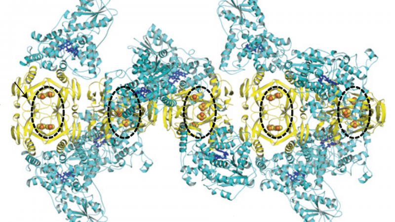 Төв хэсэгтээ полимержсэн MagR уураг (төмрийн атомын гогцоонуудын хамт, шар өнгөөр), тойроод ороомог хэлбэртэй Cry уургууд сүлжсэн байна (цэнхэр өнгөөр)