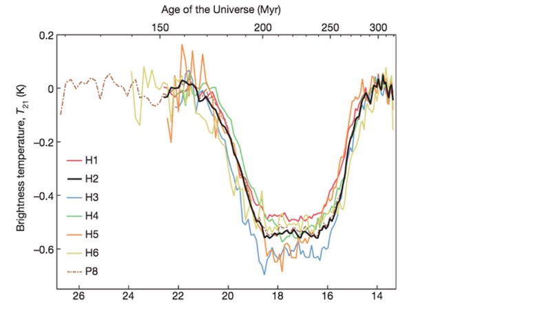 Зурагт туршилтын үеэр долоон өөр детекторт хэмжигдсэн үр дүнг харуулав. Хэдий дэвсгэр шуугиан ба сонирхож буй дохионы харьцаа өндөр ч бүх бүртгэгчид "шингээлт" ажиглагдсан байна. 21 см долгионы урттай фотонууд нь дэлхийд ирэх үедээ улаан шилжилт болох тул өөр өөр давтамжийн мужуудад хэмжигджээ. Өөр өөр улаан шилжилтүүд нь ертөнцийн насны өөр өөр үеүдэд хамаарагдана. Ертөнцийн насны хэмжээ (Их тэсрэлтээс хойш) графикийн дээд тэнхлэгт дүрслэгдсэн бол доод тэнхлэгт улаан шилжилтийн хэмжээг харуулжээ.