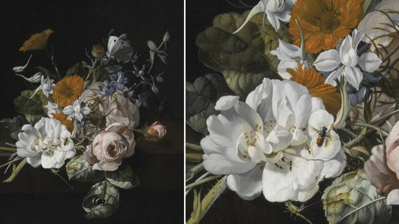 1695 он, "Still life of flowers with a nosegay of roses, marygolds, larkspur, a bumblebee and other insects"