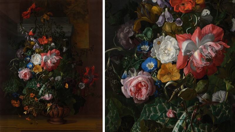 1688 он, "Roses, Convolvulus, Poppies, and Other Flowers in an Urn on a Stone Ledge"