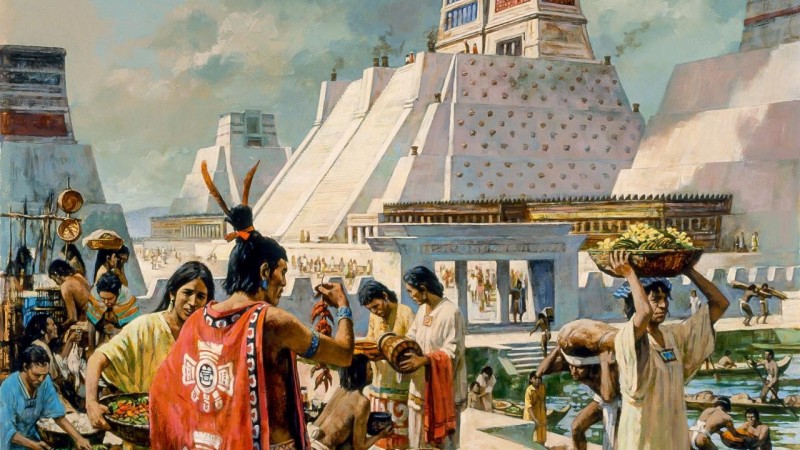 Монтесума хаан гинжин хэлхээ мэт бүлэг арал дээр орших сүр жавхлант хотынхоо гадна Кортез болоод түүний багахан цэргийг хүлээж авав. Испаничууд хотод ормогцоо Европын аль ч хотоос дутахааргүй тансаг сайхныг нь бишрэн дуу алдсан гэдэг. Хотын гудамж өргөн, цэгцтэй, суваг шуудуу нь шинэхэн, замгүүр нь гоёмсог байж. Харин хэдэн мянган хүн холхих төв талбай, задгай захад нь байхгүй юм үгүй байв. Хаандаа илгээсэн захидалдаа Кортез "Энд худалдахгүй зүйл гэж алга. Өмнө нь харагдаж үзэгдээгүй жимс, ногоо тэргүүтэн, алт, мөнгө, цагаан тугалга, гууль, зэс, амьтны арьс үс, дун, хясаа, хуягаар хийж, үнэт эрдэнийн чулуу шигтгэсэн гоёл чимэглэл, тоосго, дүнз гээд юм бүхэн байна. Ан амьтан, жигүүртэн шувууд худалддаг, бүр ховор ургамлын зах хүртэл байх юм" гэж бичжээ. Эмийн сан, үсчин, дэн буудал, нарийн боовны мухлагаас гадна зургийн будаг, хэрэгсэл, сав суулга худалддаг мухлаг бий тухай ч тэрбээр дурдсан байна. Кортезийн тэмдэглэснээр худалдаа, зээлийн газар бүрт гурван шүүгч байнга суух ба иргэд, наймаачдын дунд дэгдсэн аливаа маргааныг газар дээр нь шүүн таслах үүрэгтэй. Хотын сүм, хийдүүд эгээ л хотын доторх хот шиг сүр бараатай, асар том талбай эзлэн оршдогийг, тэдгээрт хүний цусаар өргөл өргөдгийг ч Кортез хаандаа дуулгахаа мартсангүй.