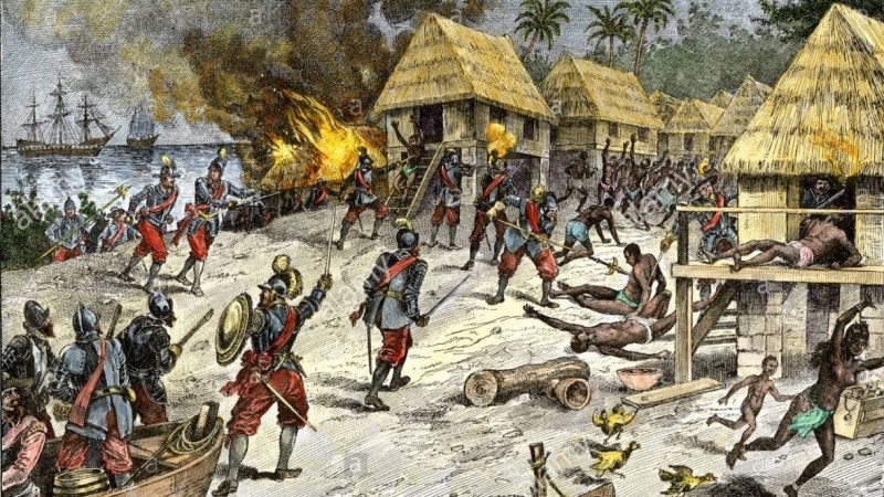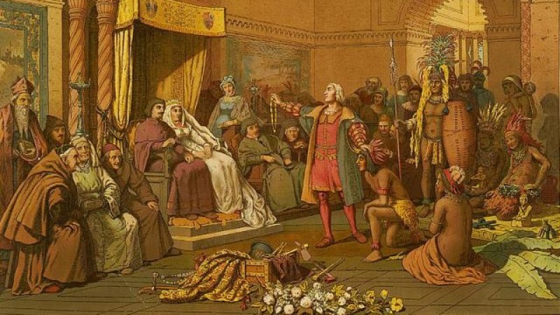 Колумб болон түүний далайчдыг тээсэн Испанийн анхны хөлөг онгоцууд эх газар бус, хэдэн бүлэг арал л нээсэн юм. Арлын уугуул иргэд харийн гийчдэд санал болгочих онцгой содон юу ч үгүй байсан ч адал явдал хайсан испаничуудын харцыг нутгийн зарим ардын хамрандаа зүүсэн алт татжээ. Алт байх газрыг сурагласан тэдний асуултад нутгийнхан баруун тийш занган хариулсан гэдэг. Ингэж Америкийн эх газар нээгдсэн түүхтэй. Испаничууд уг нь үлгэр домогт гардаг Эльдорадо нутгийг хайж байв. Төсөөлөлдөө хэт автан, эрдэнэсийн хотыг тэр чигтээ алтаар хучигдсан гэж бодож байсан тэд үнэн хэрэгтээ далайн дээрэмчдээс дээрдэх юмгүй байлаа. Шуналдаа хөтлөгдөн, эрээгүй авирлаж, нутгийнхныг мөлжиж, дарлах болсон тэдний аялагч хүнд байх учиртай аймшиггүй эр зориг яваандаа хэрцгийлэл, юу ч хийхээс буцахгүй догшин ширүүн араншин болж хувирчээ. Хамгийн харамсалтай нь тэд өөрсдийгөө загалмайтны шашинтан хэмээж байвч загалмайн ёсонтой харшилдах бүхнийг үйлдэж байсан юм.