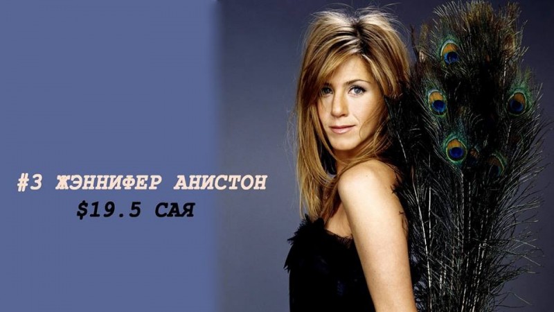 Нөхөр Жастин Тероксоосоо салсан ч ганц бие амьдралдаа гутралгүй уран бүтээлээ үргэлжлүүлж яваа дайчин бүсгүй Жэннифер Анистон энэхүү жагсаалтын 3-р байранд жагсчээ. Тэрээр өнгөрсөн 1 жилийн хугацаанд 19.5 сая долларын ашигтай ажиллажээ.