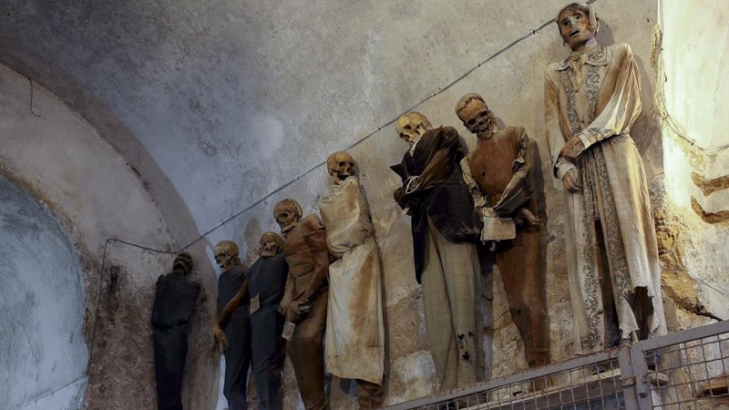 Палермо хотын Капучин хийд гаднаасаа тун чамбай загвар хийц бүхий хүйтэн хөндий барилга юм. Тус хийд мафийнхны 1992 онд Борселлино шүүгчтэй “тооцоо бодсон” газрын харалдаах оршуулгын газрын хажууханд оршино. Сүмийн үүдэнд гэлэн нар тасалбар, ил захидал, танилцуулга худалдах агаад дотогш орж, шатаар уруудмагц Гашуудлын хатагтай хэмээх модон хөшөө бий. Харин хөшөөний хажууханд үхэгсдийн хүлээлгийн өрөө буюу хонгилд нэвтрэх хаалга үзэгдэнэ. Тэрхүү өндөр гулдан таазтай, аварга том, урт нарийн танхим ихэнхдээ жихүүн, чийгтэй байх бөгөөд хуучин хувцасны тоос, эхүүн, нэгширсэн үнэр хамар сэтлэх шахна. Танхимын том цонхнуудаас гадна таатай үнэр ялгаруулагч чийдэн, дэнлүүнүүд шуудхан нүдэнд тусах ажээ.