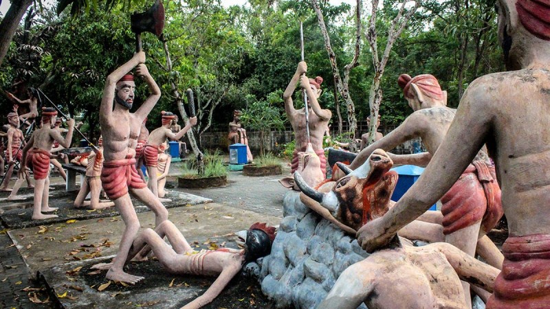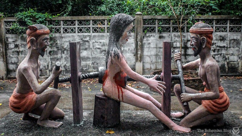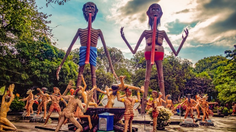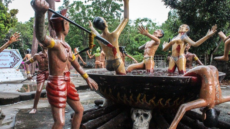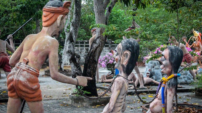 Энэхүү ер бусын цэнгэлдэх хүрээлэнд зүрх муутай, сэтгэлийн хат багатай хүмүүсийг орохыг хориглодог гэнэ. Учир нь энд “газрын там” л ийм байх болов уу гэмээр аймшигт дүр зураг ноёрхдог нь нэрнээсээ л илт. Энд загалмайд цовдлуулж нас барсан, гарцгүй харанхуй нүхэнд үй олноороороо булшлагдаж буй болон үлгэр домогт өгүүлдэг аймшигт амьтдын идэш болж буй зэрэг аймшигт мөхлүүдийн бусад арга барилыг ашиглан үхсэн болон тарчлан зовж буй хүмүүсийн дүр зургийг элдэв хөшөө, баримлаар хуулбарлан бүтээсэн байдаг аж. Түүнээс гадна парк дундуур явахад хэсэг бүр өөр өөрийн онцлогтой ёрын муухай дуу, хашхираан, аймшигт чарлаан бүхий тарчлагчдын зовлонг илэрхийлсэн хөгжим явуулдаг нь тухайн орчинг улам ч аймшигтай болгодог байна. Сонирхолтой нь тайландчууд энэ парк уруу хүүхдүүдээ дагуулан ирэх нь түгээмэл гэнэ. Магадгүй энэ нь хүмүүжил, боловсролын зорилготой байх л даа. Гэхдээ л хүүхэд байтугай насанд хүрэгчдийн хувьд аймшигт мэдрэмж төрүүлэхээр ийм парк энэ ертөнцөд байдаг нь хачирхалтай. Нүгэлтнүүдийн парк Бангкок хотоос 40 км-ийн зайд буддын сүмийн нутаг дэвсгэр дээр оршдог аж.